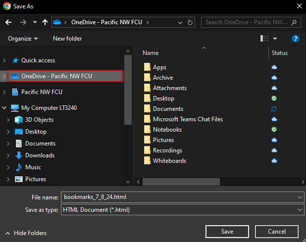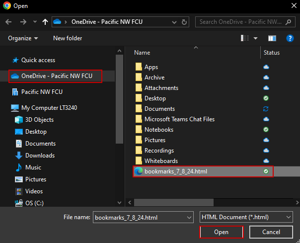 Select the bookmarks.html file saved earlier in your OneDrive and click Open.