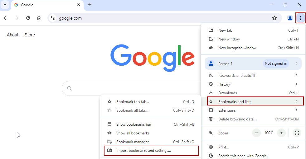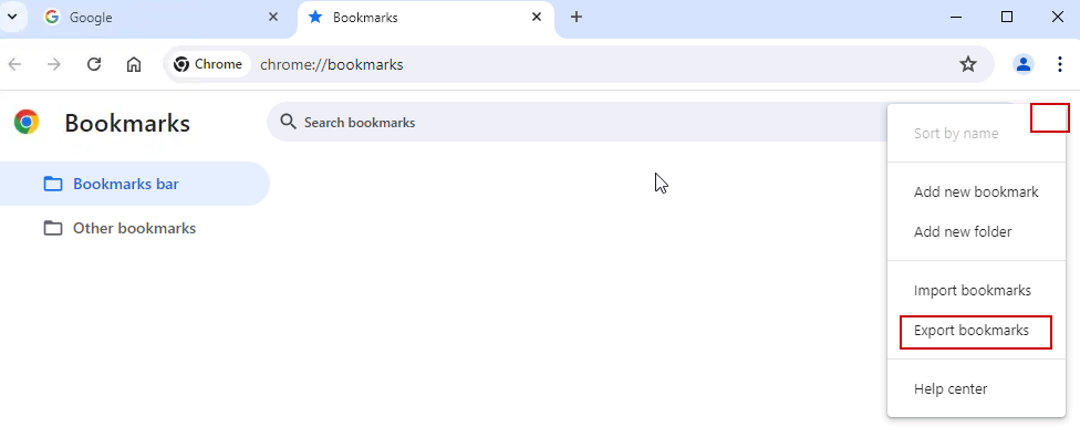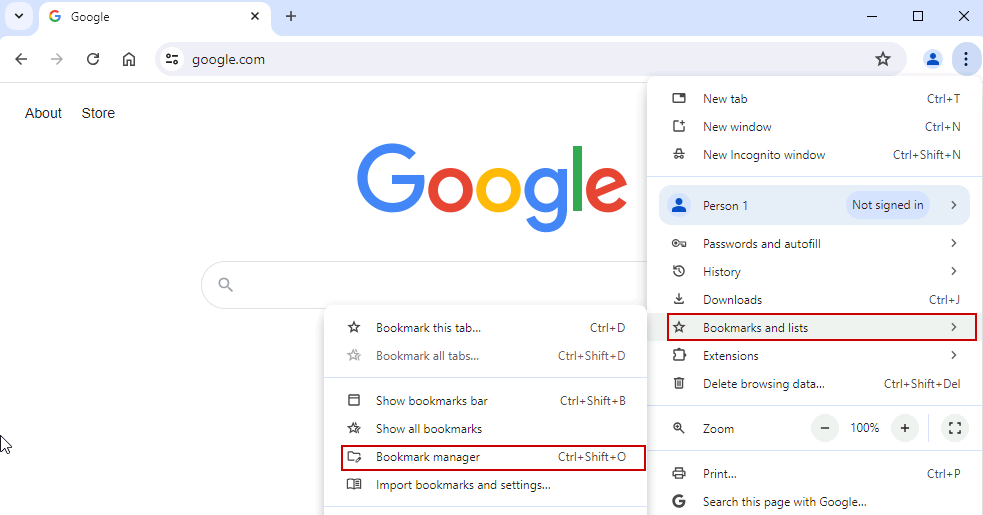 Open a new Chrome window. Click the overflow menu (three dots), and select Bookmarks and lists > Bookmark manager.