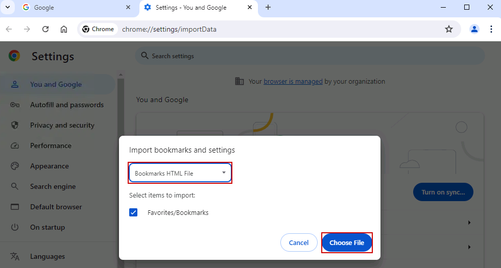 Select Bookmarks HTML file in the dropdown and click Choose File.