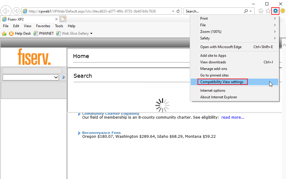 To correct click the settings menu and select Compatibility View Settings.