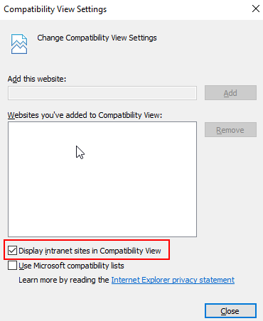 You will see a seperate window open. Uncheck the Display intranet sites in Compatibility View checkbox and click close.