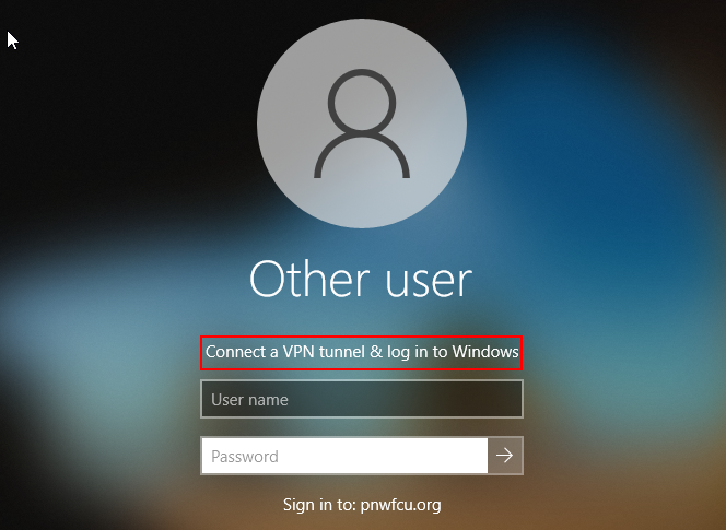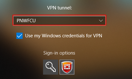 3. After selecting you should see “Connect a VPN tunnel & log in to Windows”. If you scroll down, you should see the PNWFCU VPN tunnel in the drop down. Leave “use my Windows credentials for VPN” checkbox selected.
