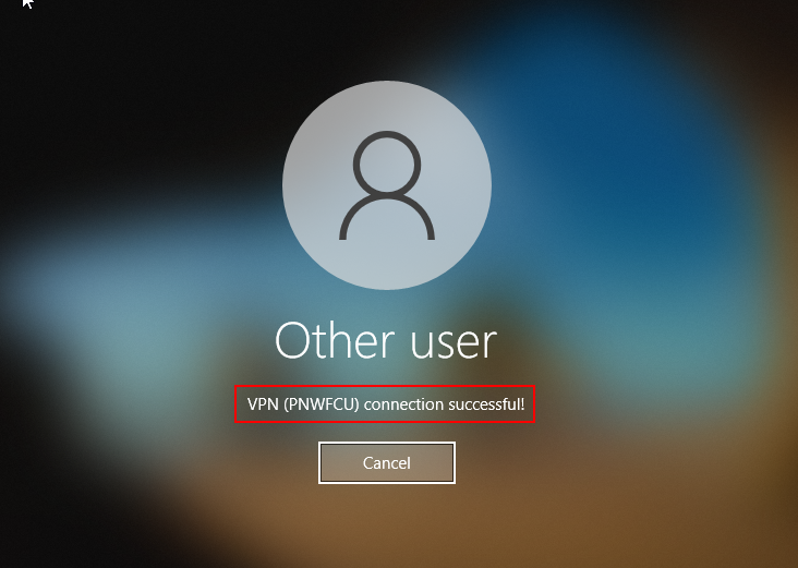 4. Once you enter your username and password and hit enter you should see the message “Connecting to VPN (PNWFCU)” and then another message “VPN (PNWFCU) connection successful.