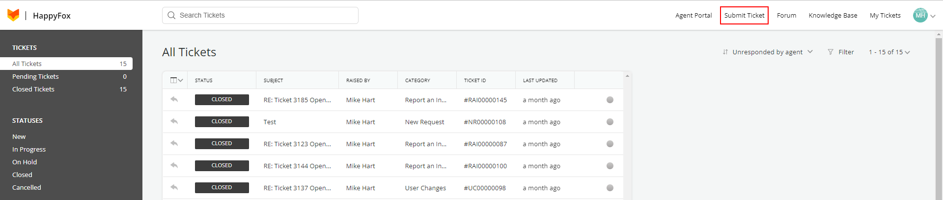 Once logged in you will see a portal allowing you to submit a ticket, view past tickets, and view the growing knowledge base.