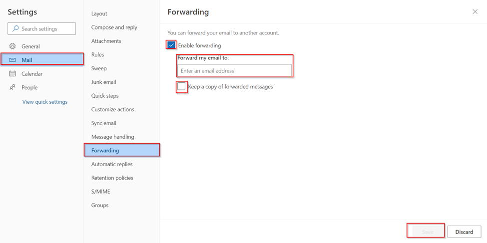 Click "Mail" then click "Forwarding". Check Enable Forwarding and type in the email. Check the box if you would like to keep a copy of the forwarded email. Then click save.