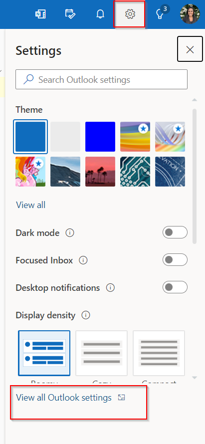 Once signed in, click on settings in the upper right corner then click on “View all Outlook settings”