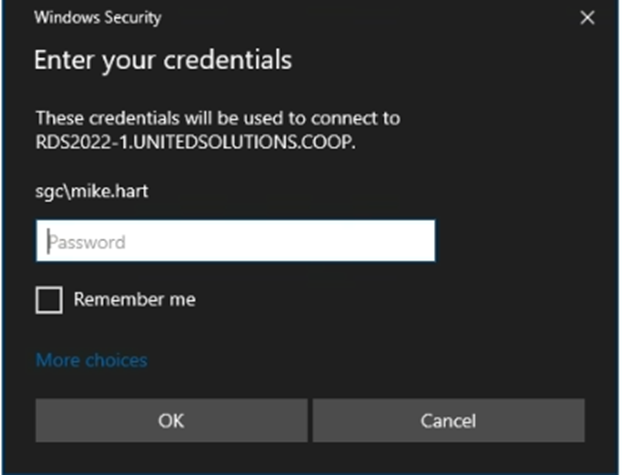 It will prompt you to enter your credentials. Click OK and it will connect you to a desktop.