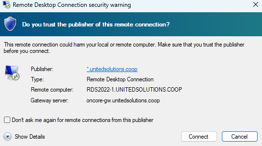 Navigate to https://oncore.unitedsolutions.coop/RDWeb/Pages/en-US/login.aspx log in with your USC credentials.