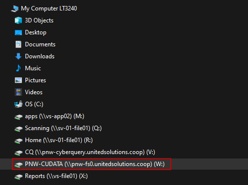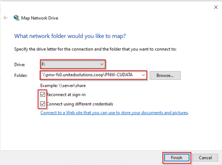 Select an available drive letter, and type \\pnw-fs0.unitedsolutions.coop\PNW-CUDATA as the folder path. Be sure both boxes are checked: “Reconnect at sign-in” and “Connect using different credentials”. Click Finish. An example is shown below: