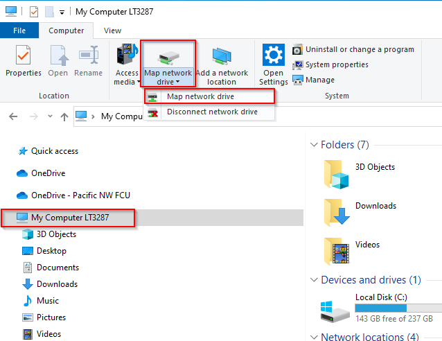 Open File Explorer. Click on “My Computer”. Then, on the computer tab, select “Map network drive” > “Map network drive”.