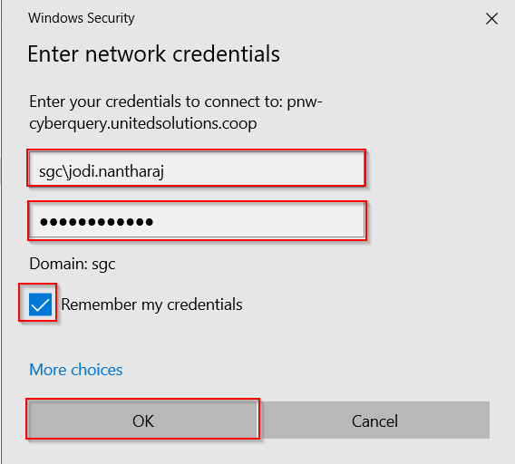 It will prompt you to enter your credentials for USC. Enter your username (sgc\firstname.lastname) and password. Check the box for “Remember my credentials”. Click OK.