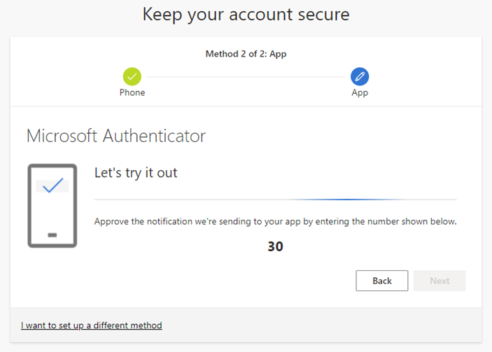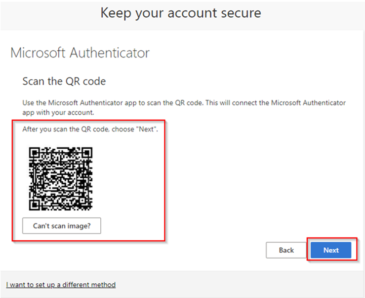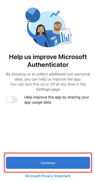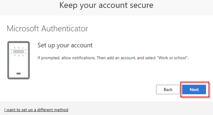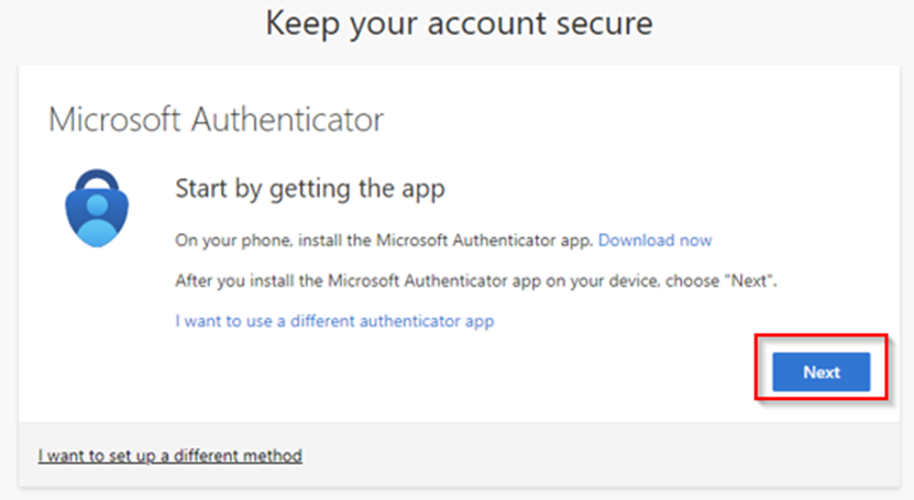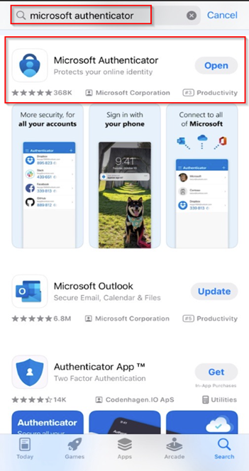 Download Microsoft Authenticator from the app store. Type in “Microsoft Authenticator” in the search bar and it will be the one listed below. Once the application has been downloaded, click Next.