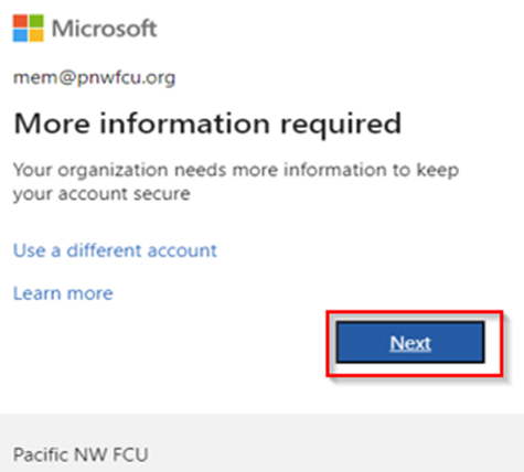 When logging in from outside the network you will see the prompt below asking for more information. Click Next.