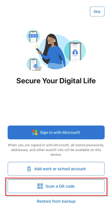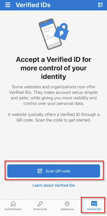 Click on Scan a QR code. If you have skipped this screen, you’ll want to click on the tab “Verified ID’s”, then click scan QR Code.