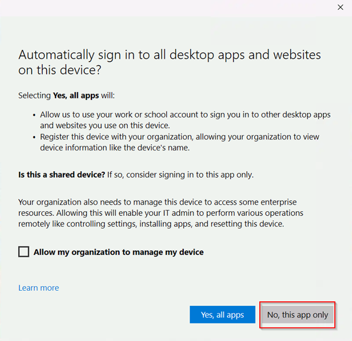 Uncheck “Allow my organization to manage my device”. Click “No, this app only”.